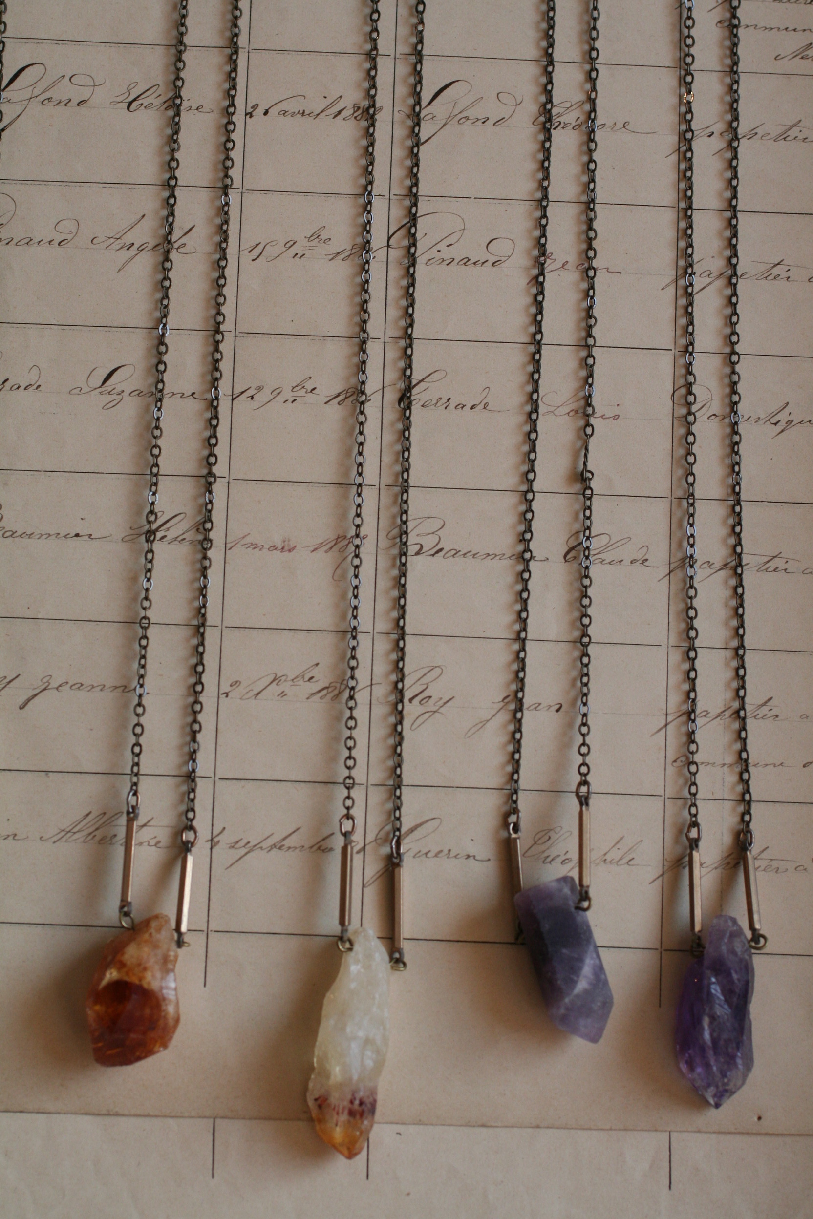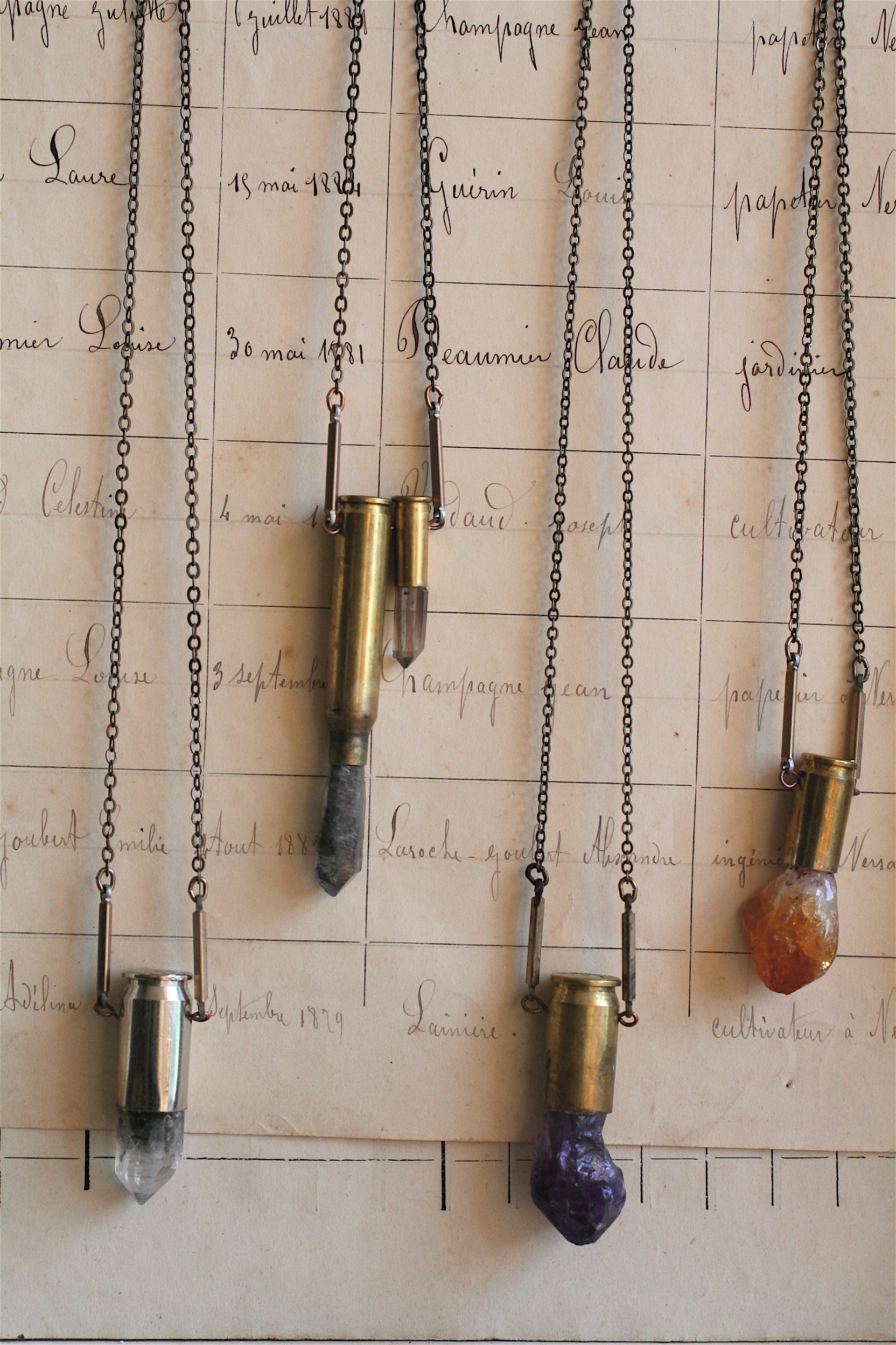 So, our new stock has started trickling in over the last few weeks and now Valentine’s and Mother’s Day is behind us we can start to feature some of the more exclusive things we’ve had in. The following photos are pictures of Rosy Maddison’s new jewellery. Rosy hand makes them all individually. Every piece is unique, made from ‘found’ pieces – including antique spoons and brass bullet casings (discarded from a shooting range in L.A.) All the stones used are semi precious stones, including Amethyst, Citrine, Clear Quartz, Pyrite and Black Tormelene.